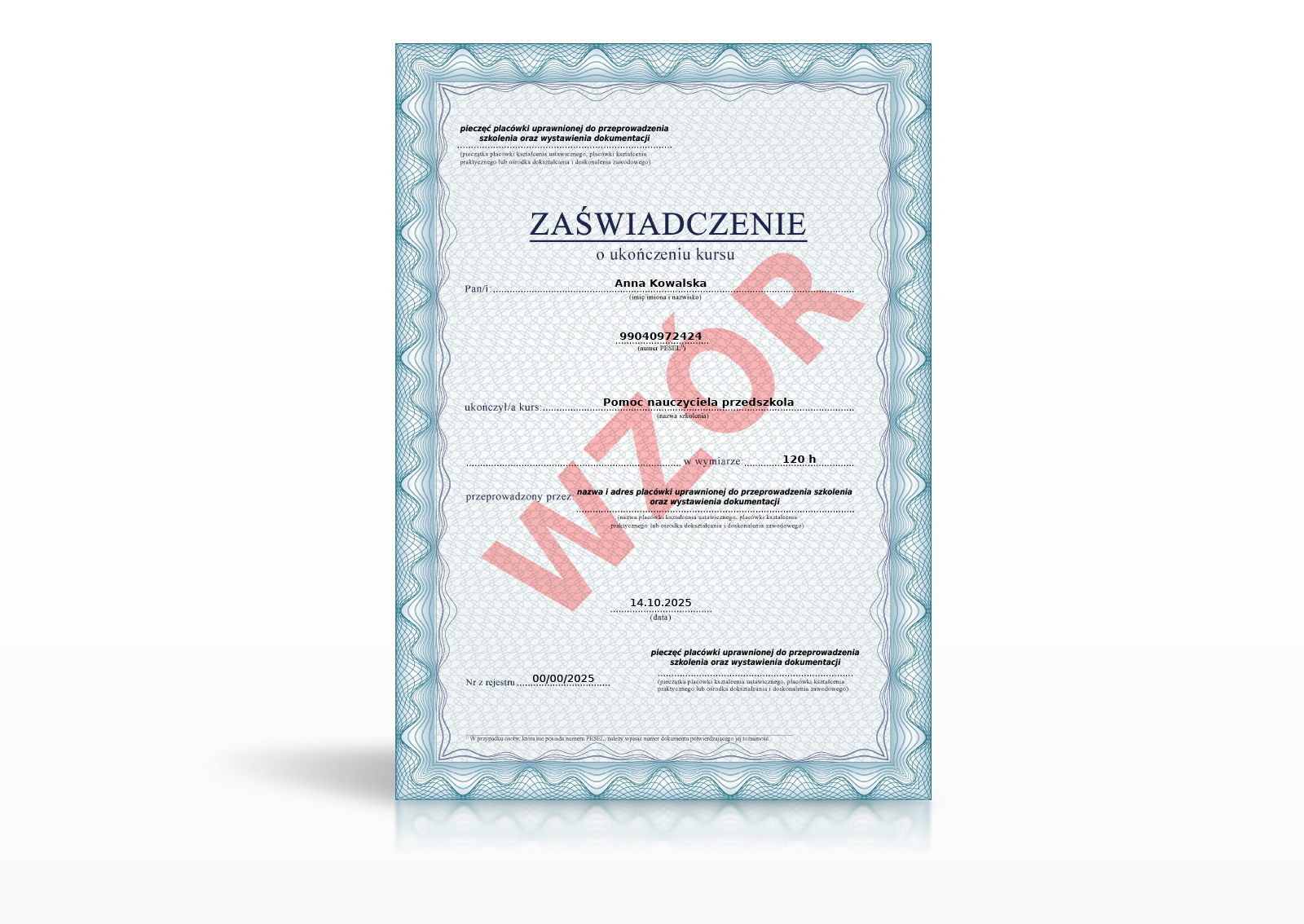 Kurs realizowany jest na podstawie art. 117 ust. 1a pkt 5 ustawy Prawo oświatowe. Po ukończeniu uczestnik otrzymuje zaświadczenie. Zdobycie zaświadczenia umożliwia podjęcie pracy w przedszkolu na stanowisku pomocy nauczyciela.