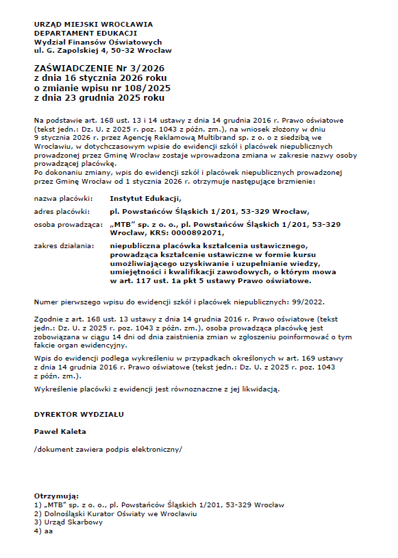 Instytut Edukacji jest jednostką edukacyjną, która zwiększa kwalifikacje zawodowe poprzez szkolenia e-learningowe: