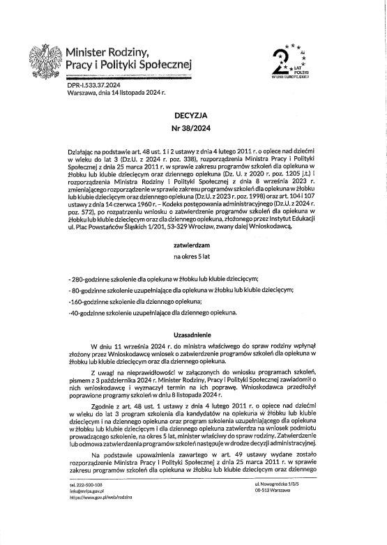 Ta innowacyjna forma kształcenia pozwala naszym kursantom odbywać szkolenia w wybranym i dogodnym dla siebie miejscu i czasie. Nauka jak i egzaminy odbywają się on-line, a każdy z naszych absolwentów otrzymuje certyfikat potwierdzający nabyte umiejętności i będący pełnoprawnym dokumentem wydawanym na podstawie decyzji Ministra Rodziny, Pracy i Polityki Społecznej (NR POZWOLENIA: DPR-I.533.37.2024 z dnia 14.11.2024 r.)